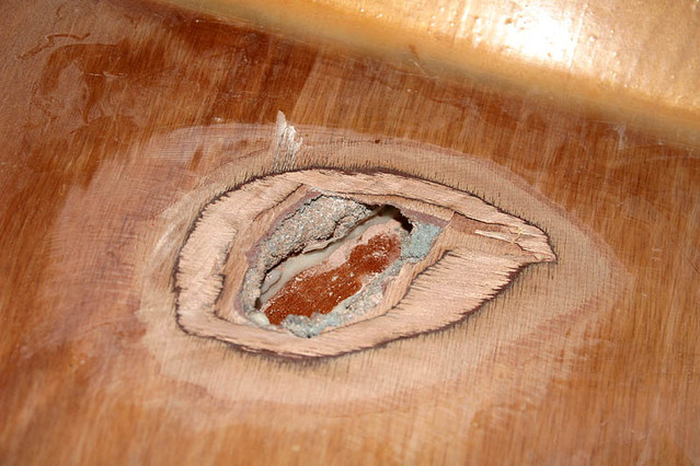 The cockpit side of the hole through the floor is ready to be filled with some magic blue stuff, and its patch glued over the top.